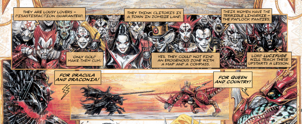 On Resurrection, at the Field of the Cloth of Crimson, Count Dracula concludes Black Opium business with Queen Perfidia of the Dystopians, and Lady Claudia Demona shows off her werewolf obedience training in a 'friendly' tournament. Down, boy! Down!